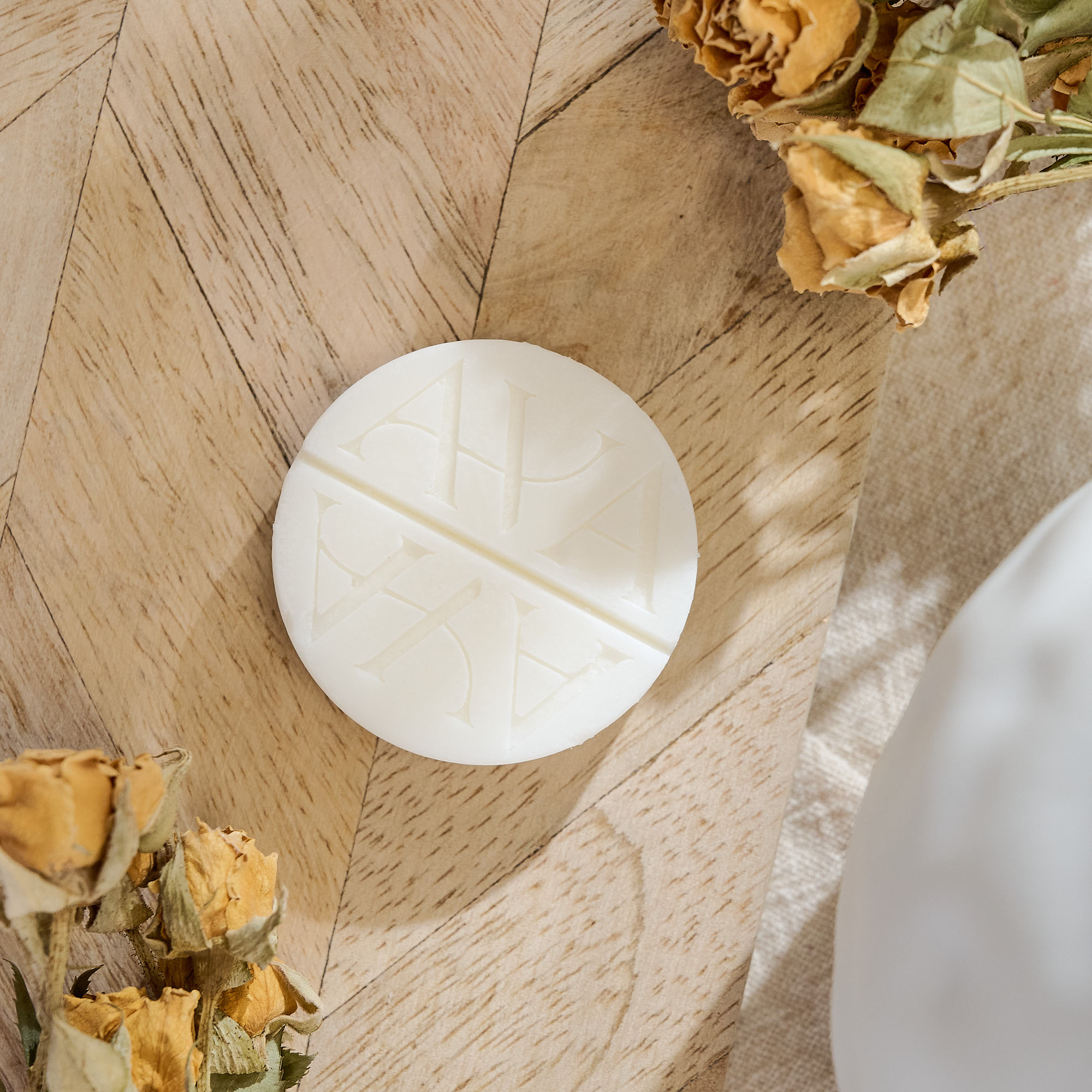 Our Damask Rose, Cedar & Oud Single Wax Disc is hand poured and inscribed with the recognisable marque, with an indent allowing the disc to be easily snapped in two. Elegantly wrapped in flecked paper, sealed and encased in a pillow pack.