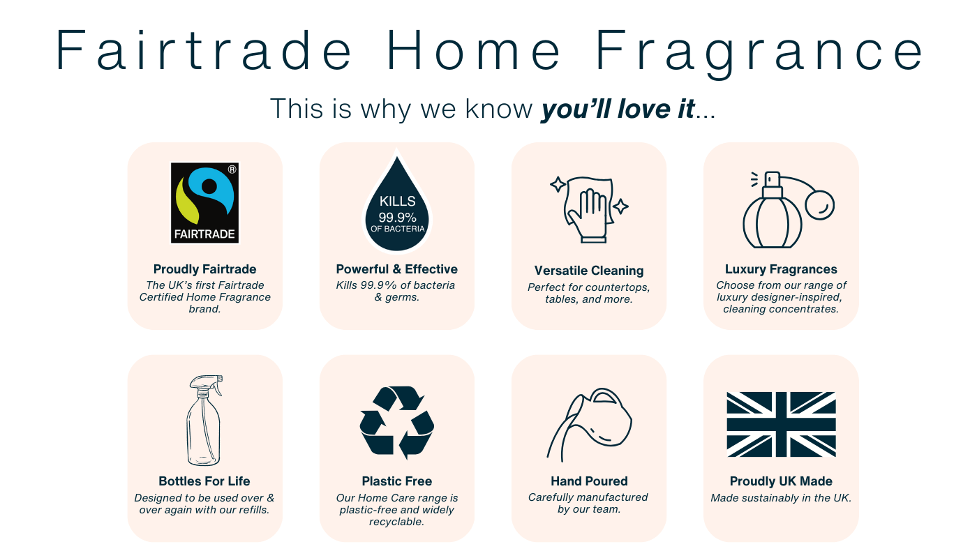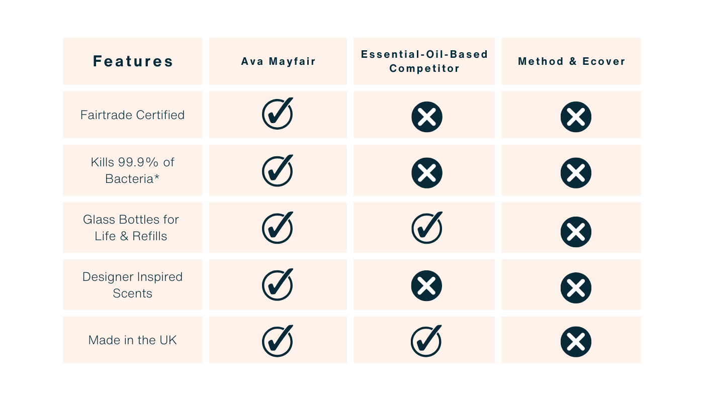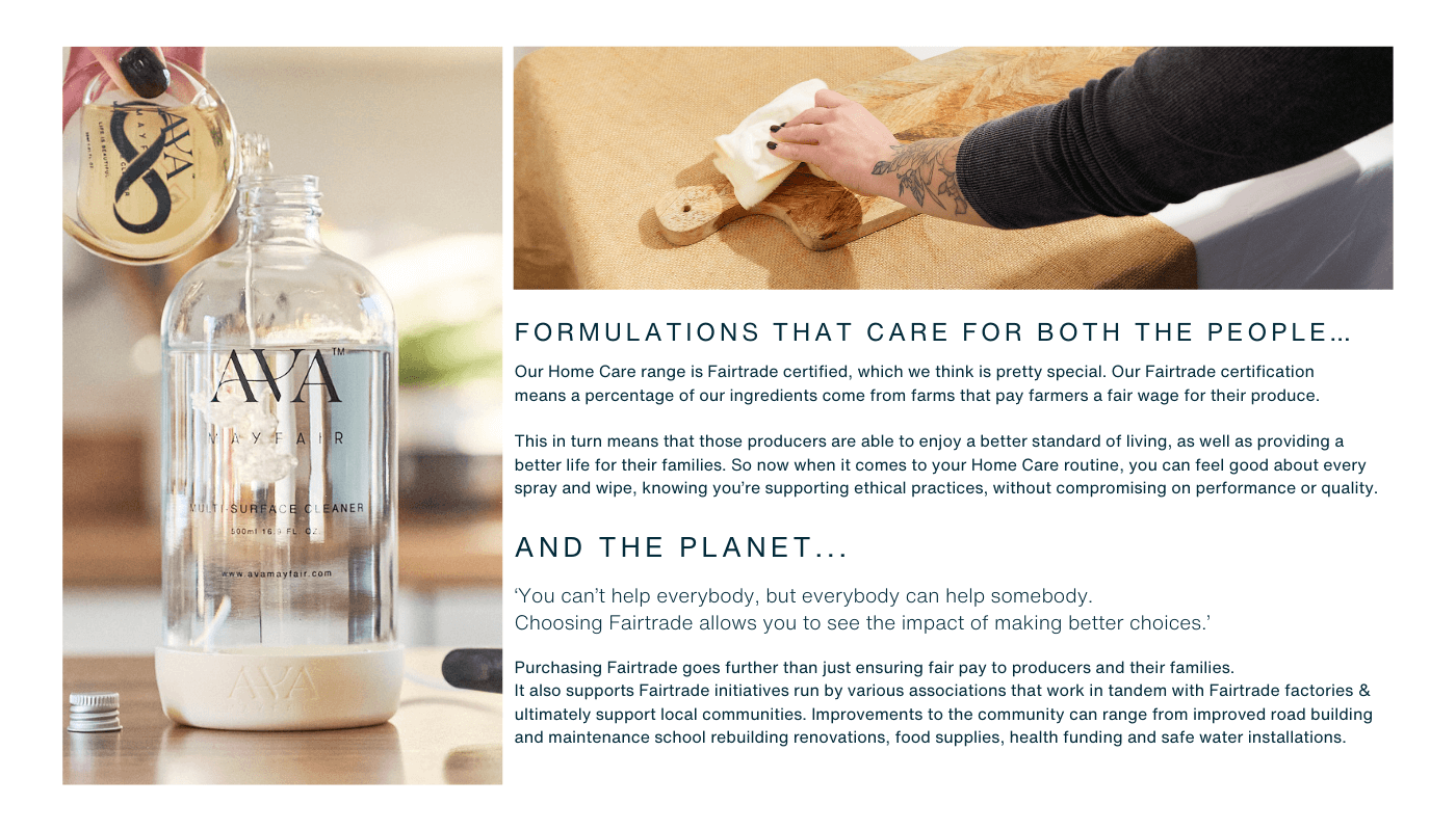 Ava Mayfair Home Care products are designed to smell good, feel good, and do good — combining high-performance cleaning with Fairtrade ingredients and sustainable refill solutions.