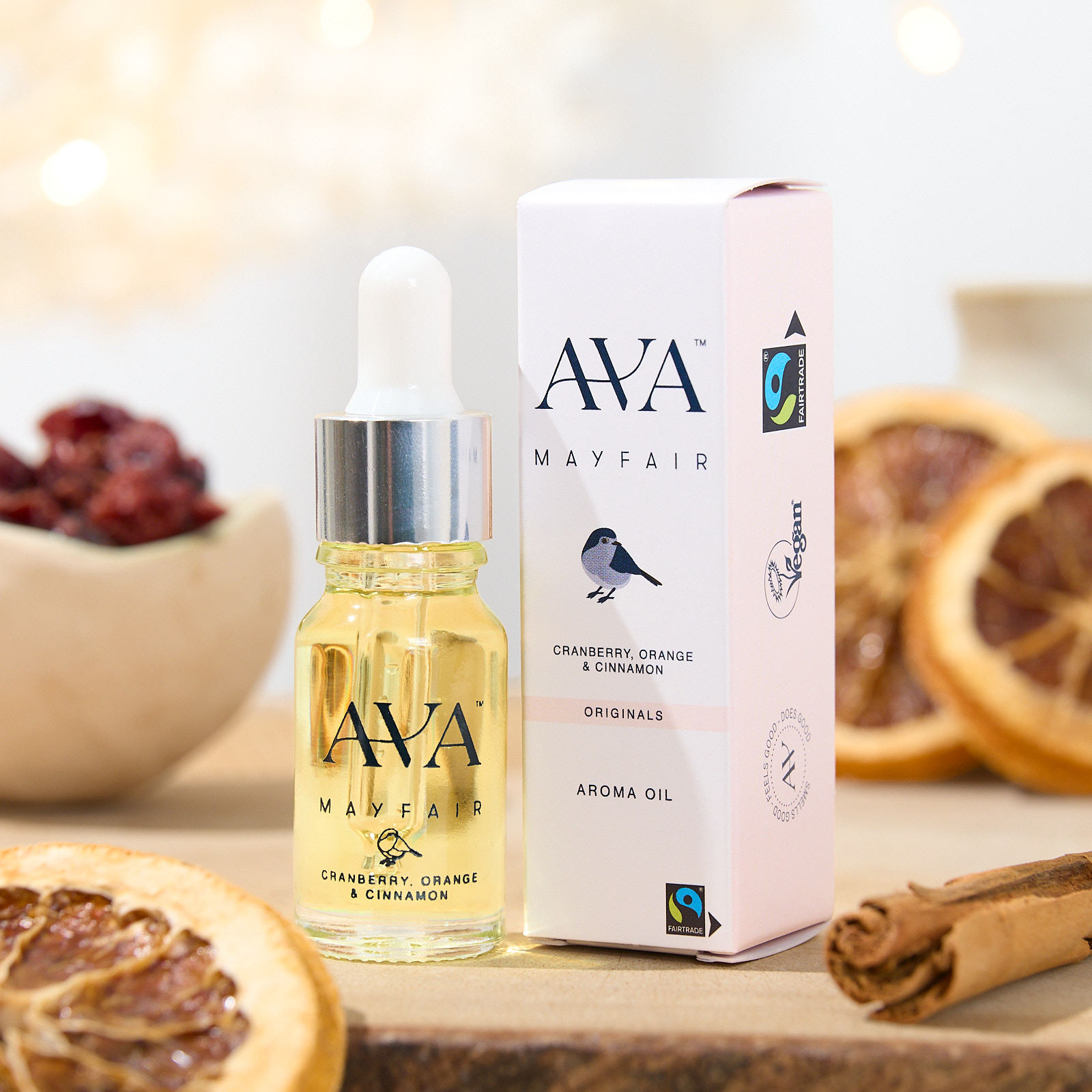 Fill your home with the scent of Christmas with the Ava Mayfair Cranberry, Orange & Cinnamon Aroma Oil. A festive blend of sweet cranberries, zesty orange, and warming cinnamon, layered with soft floral tones and a smooth base of cedar, musk, and vanilla.