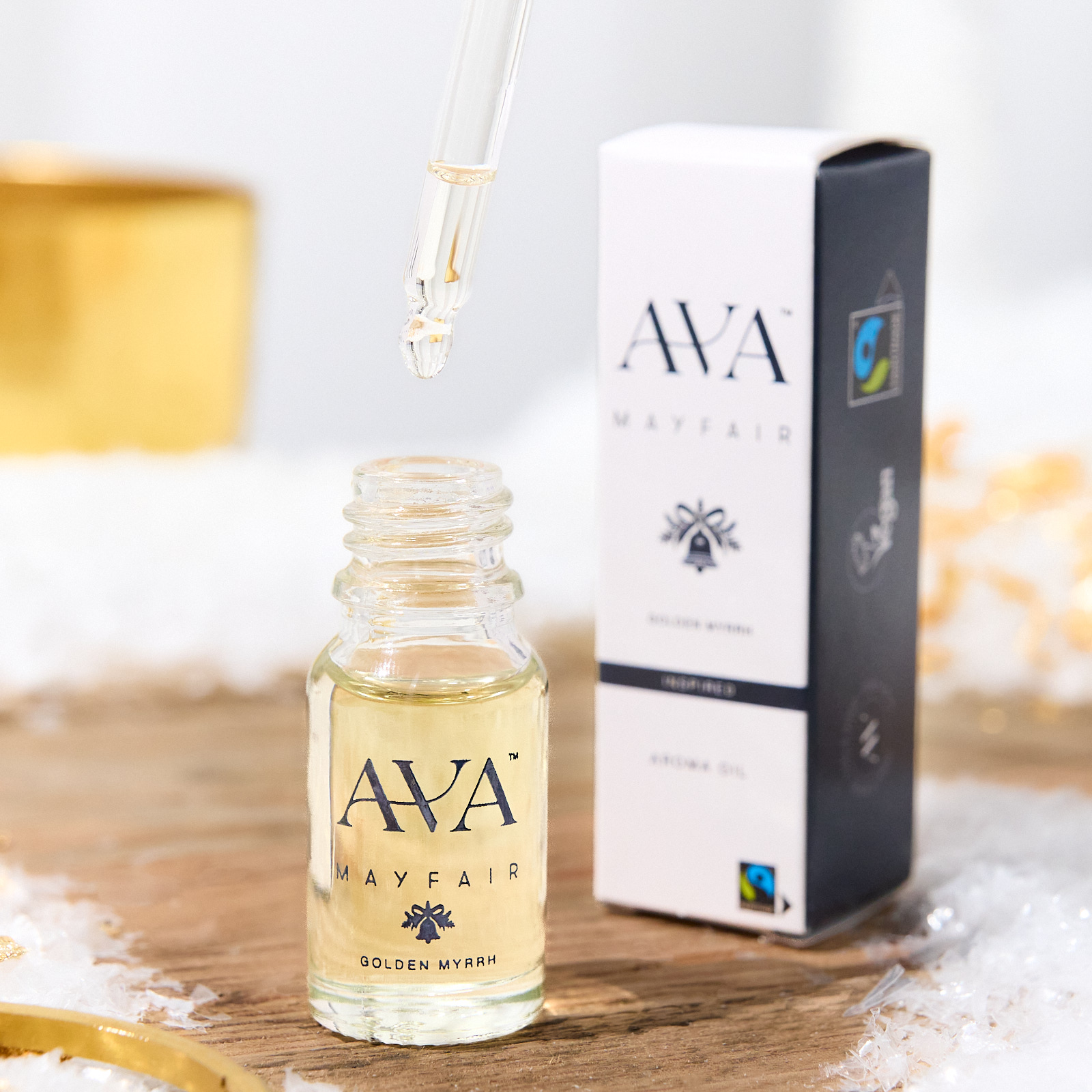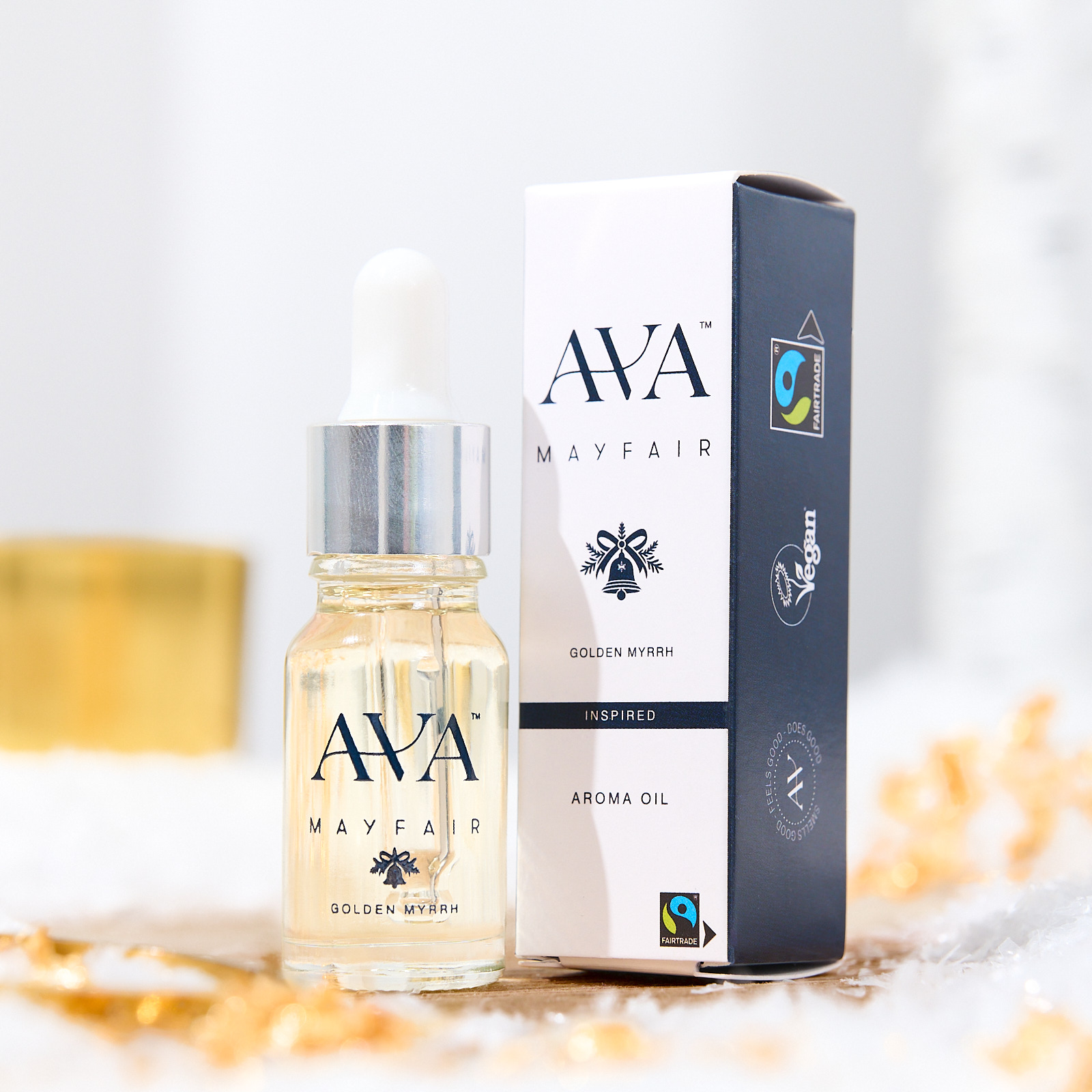 Fill your home with elegance and warmth with the Ava Mayfair Golden Myrrh Aroma Oil. A refined blend of amber, myrrh, and sandalwood, enriched with vanilla, musk, and soft woods for a truly luxurious festive scent.